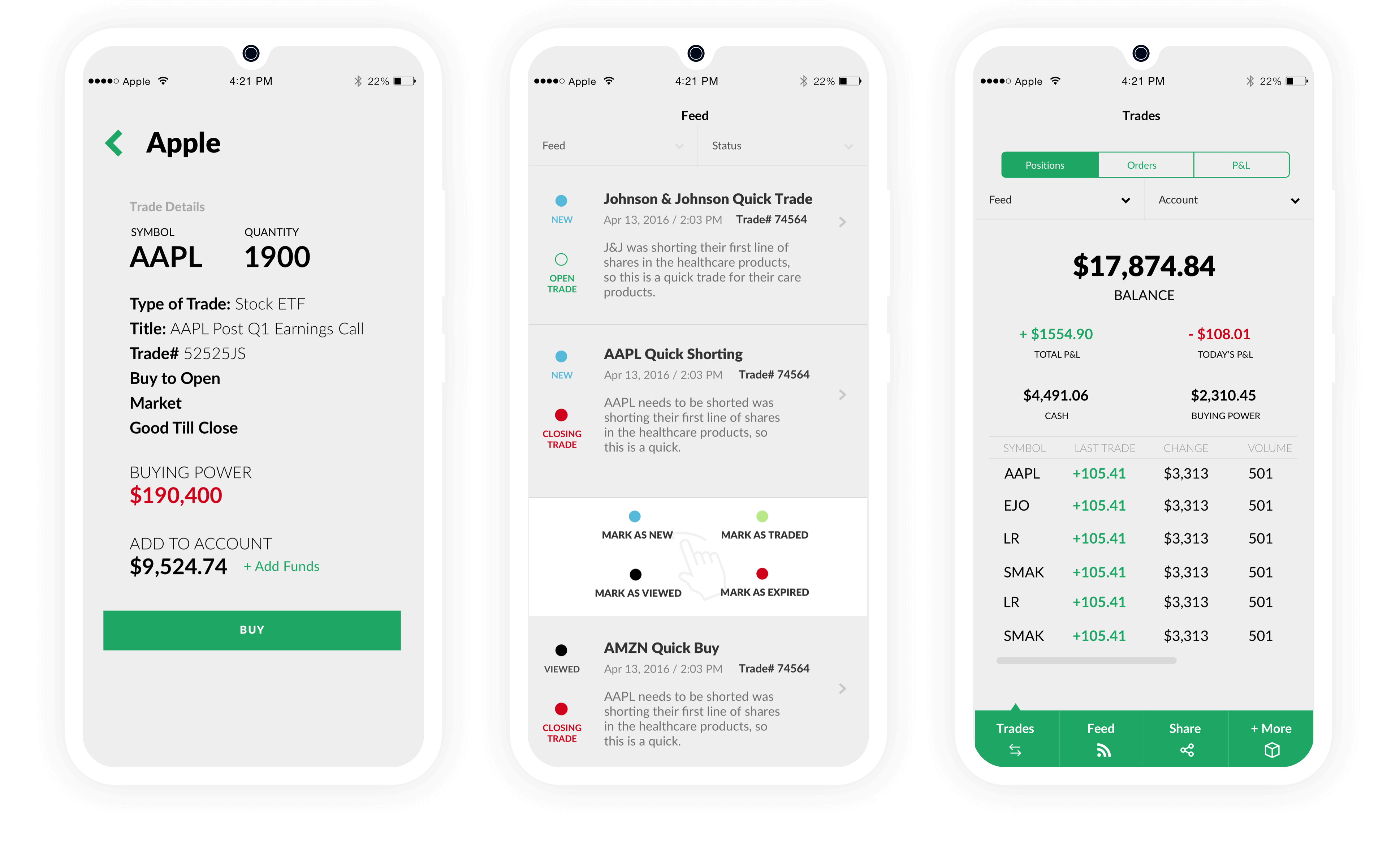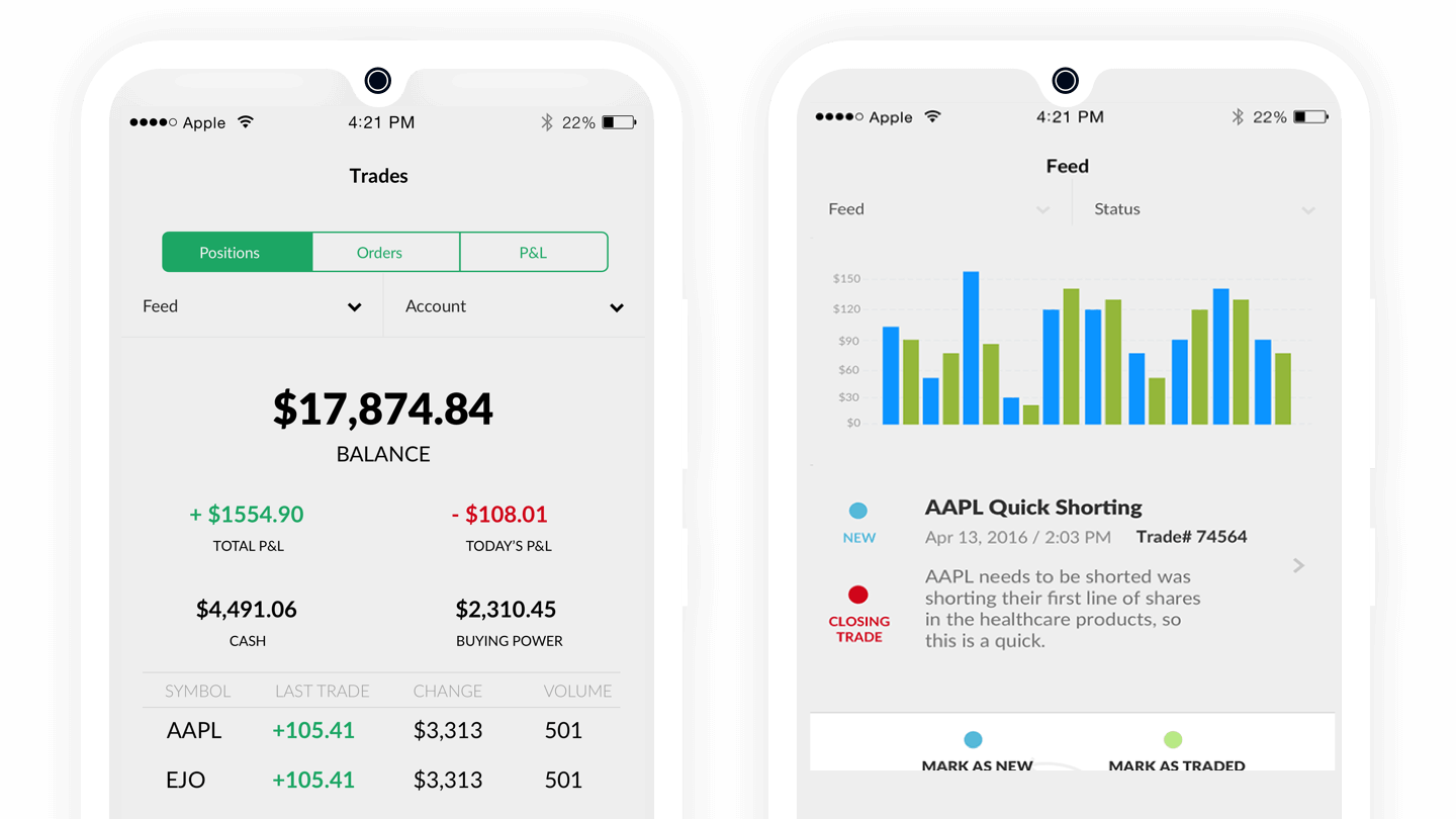 Trade Exchange is a marketplace for subscription-based advice centered around Intelligent Tracking. We provide individual investors access to a directory of verified trading and investment strategies that originate from gurus, newsletters, quants, individuals, and former asset managers. Once a user subscribes to a particular strategy they receive actionable alerts through our app that can easily be acted upon with a couple of clicks. With Intelligent Tracking, users always know what each source provided them, what they did with that information, and what happened on the trades they didn't take. The platform levels the playing field for both strategy publishers and self-directed investors.
